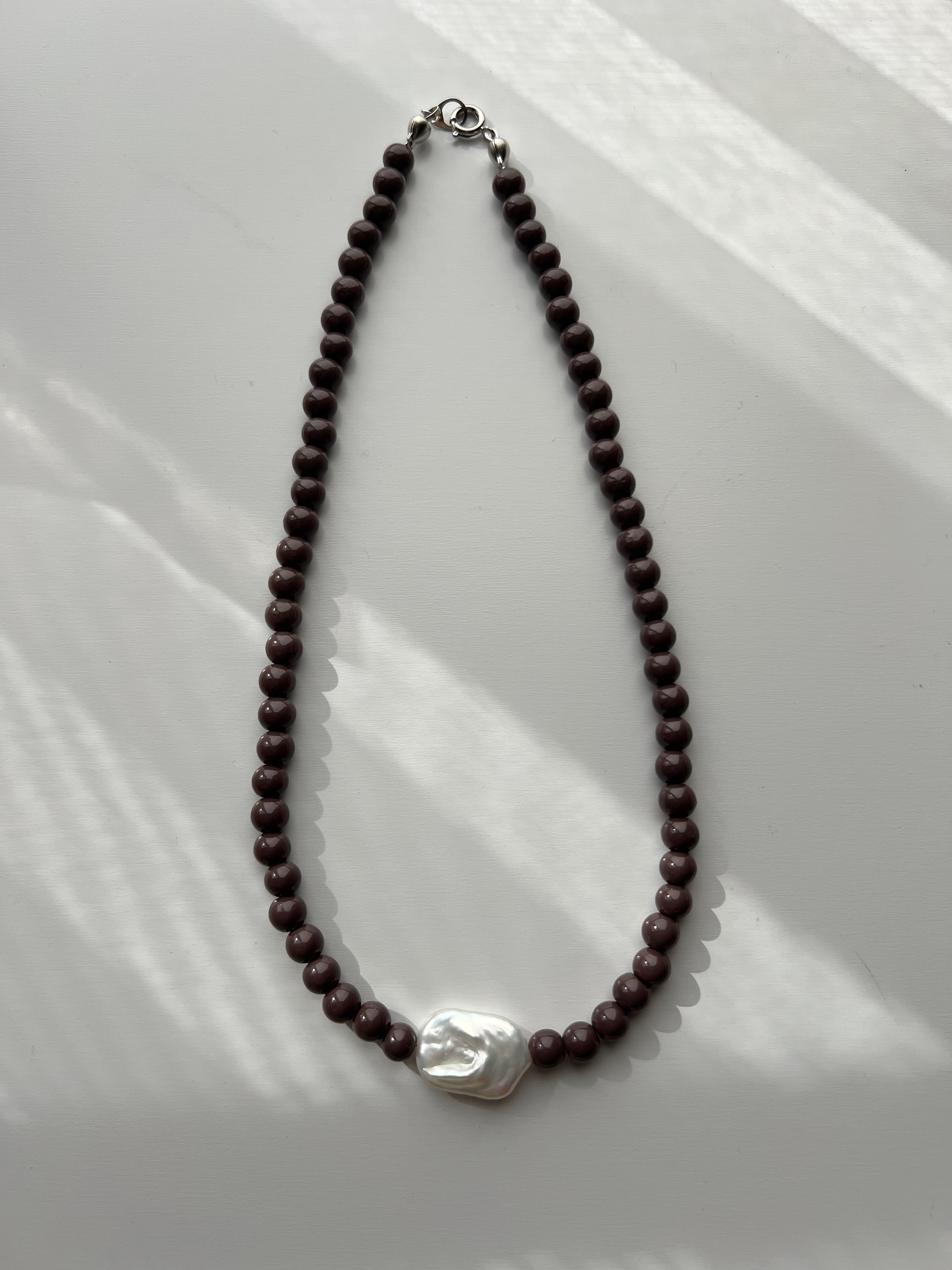 秋らしいモカブラウンのビーズに天然淡水パールの