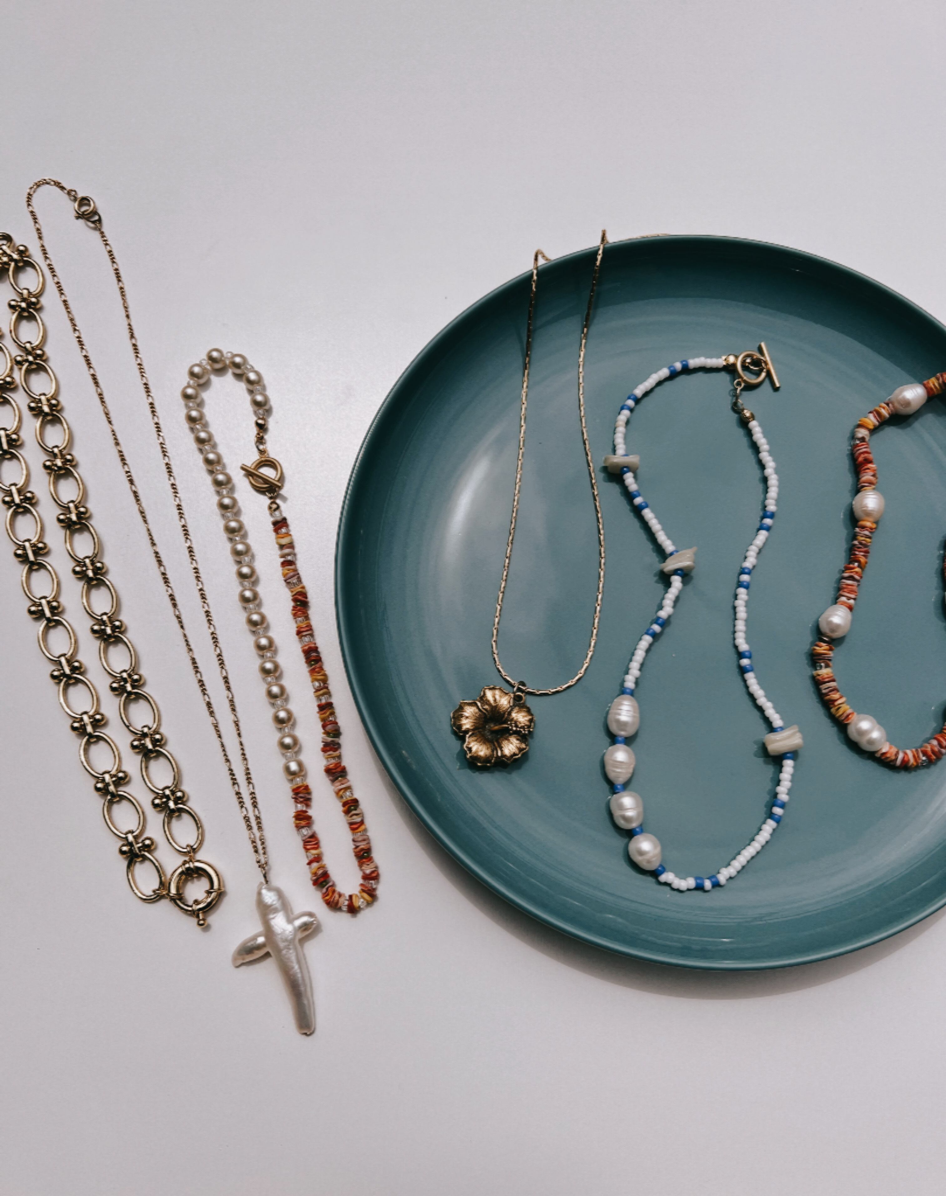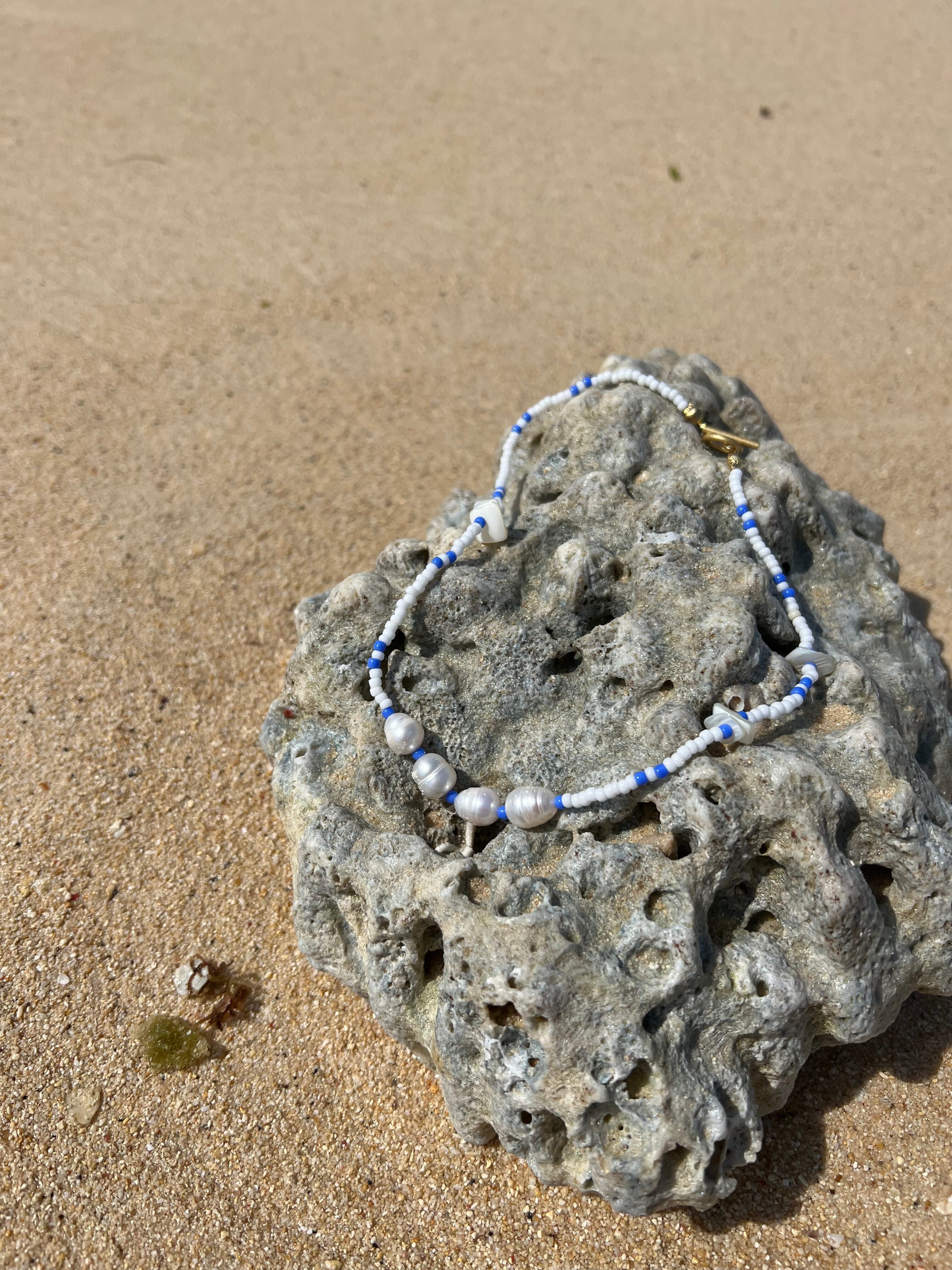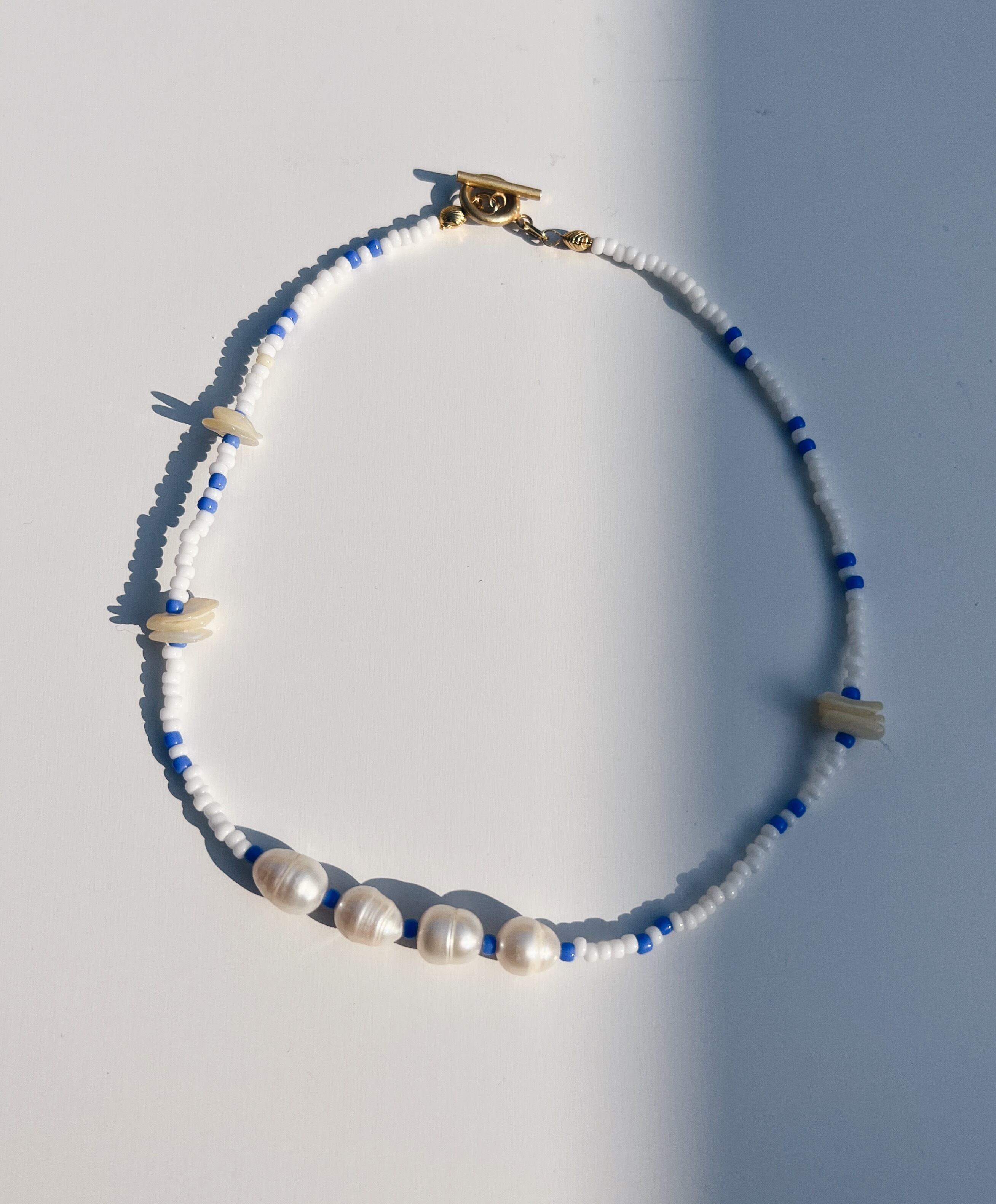 マリンカラーのビーズと淡水パール、シェルを使ったネックレスです。