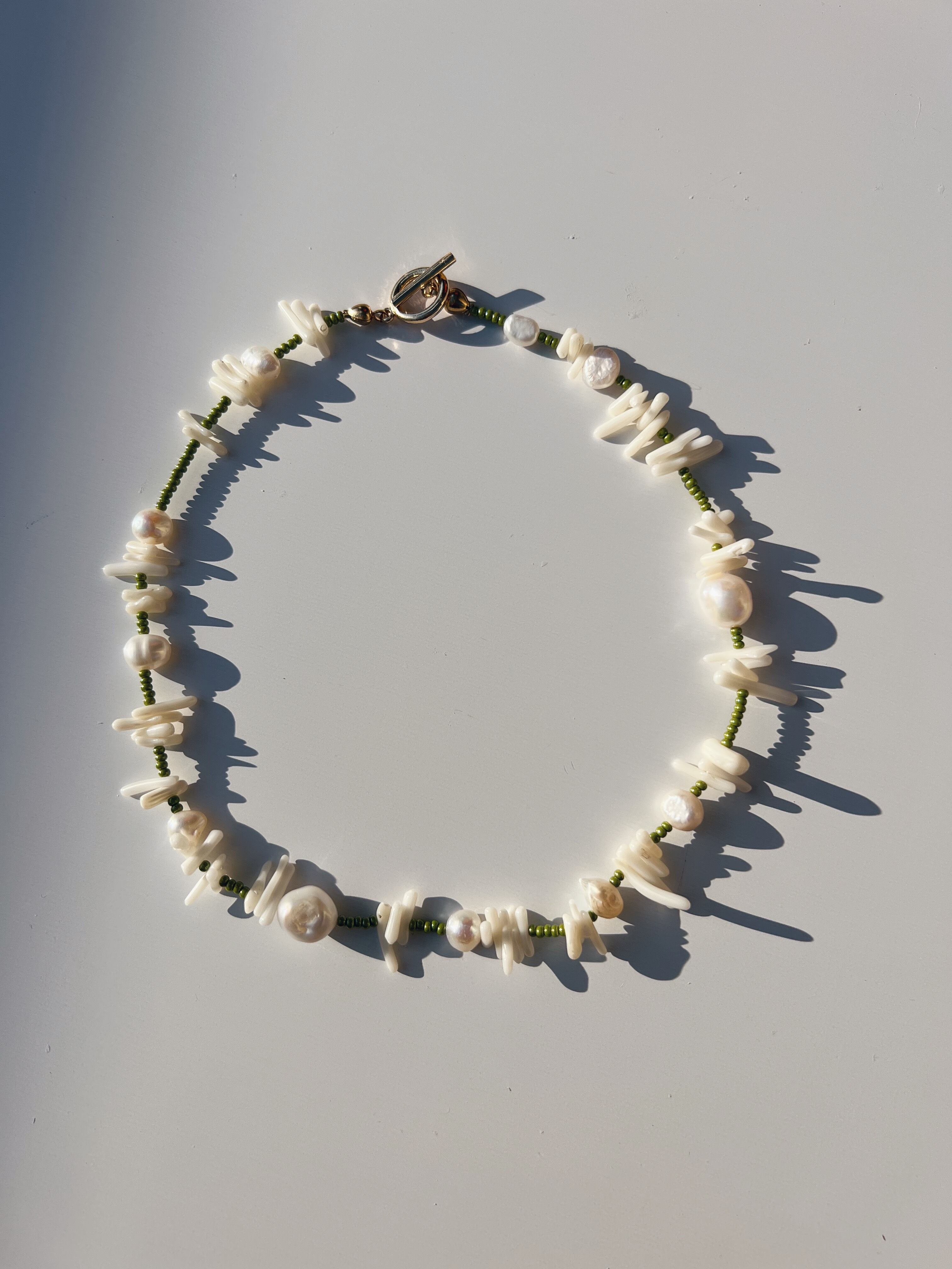珍しいカーキのビーズに天然淡水パールと天然珊瑚を贅沢に使いました。
